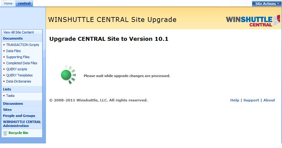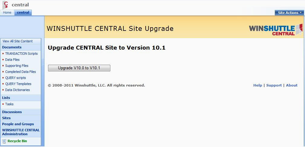 - On the CENTRAL site, click CENTRAL Administration, and then click Upgrade V10.0 to V10.1.