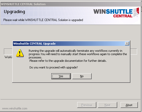 The installer displays a warning message that all the existing workflows will be terminated during the upgrade process.