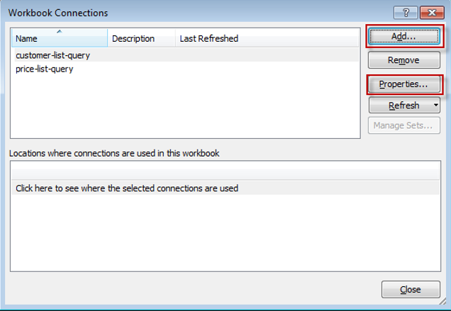 - In the Workbook Connections dialog box, click Add.