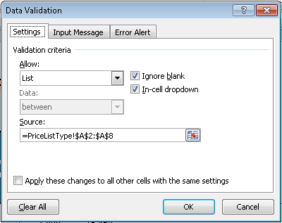 - In the Data Validation dialog box, on the Settings tab, do the following: