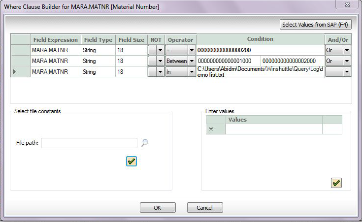 Type a condition to define the search, or press F4 to see a list of SAP values that are allowed for that field. |