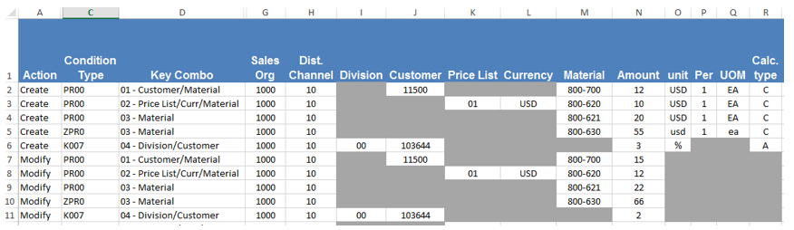 Drop down lists were used for Action (column A) and Condition Types (Column C) in the sample spreadsheet tab AllPrices. A dependent drop down list was used for Key Combo (Column D) due to the dependency on the Condition Type (Column C). This prevents the user from selecting an invalid combination of Condition Type and Key Combo.