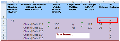 In diesem Beispiel sind die Daten eines Datensatzes auf mehrere Zeilen aufgeteilt. Für mehrzeilige Transaktionen, ist die erste ID-Spalte von Excel im Standard für die Excel-Spalten-ID reserviert. Die erste ID-Spalte speichert den Zeilentyp, der im Standard entweder H (Header) für Kopf- oder D für Detail-/Positionszeilen lautet. Beim Ausführen der Transaktion lädt TRANSACTION alle Daten vom Zeilentyp H in den Kopfabschnitt der SAP-Transaktion und alle Daten vom Zeilentyp D in die im Mapper angegebenen Positionen hoch.