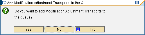 - If the Add Modification Adjustment Transports to the Queue window appears, this component has an independent and unique namespace that is assigned by SAP. Click No.