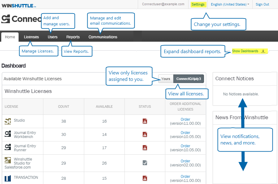 If you are a Winshuttle Administrator or User & License Administrator for your Connect site (see User roles and permissions), you can also assign licenses, add and manage users, and more.