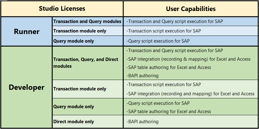 The Winshuttle Desktop licensing structure is based on the number of users and the module or modules they use. There are two distinct user types: Runner and Developer. In general, a user with a Runner license may run scripts (only), and a user with a Developer license may run scripts and develop scripts. Each user needs a license which corresponds to the specific work that they do, as noted in the table below.