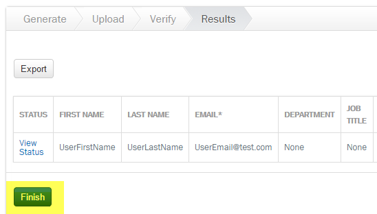 - On the Results tab, click Finish. You can click View Status to check user creation results.